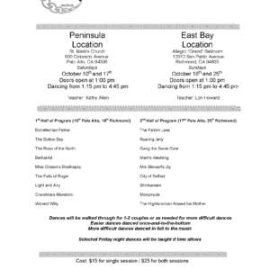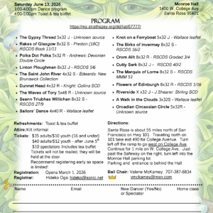 An Evening Scottish Country Dance with live music hosted by the Livermore and Lafayette Classes. Walkthroughs start at 6:45pm. Don’t miss this important event. During the intermission, we get to hear about the voting results, the branch financial performance, strategic direction, and an opportunity to raise concerns and ask questions of the board. Dancing starts […]